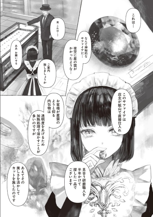 メイドの優れた観察眼は、来店客と宝石との素敵な出会いへと導きます。宝石店の中で繰り広げられる、人と宝石の心温まるドラマが魅力的な漫画です。